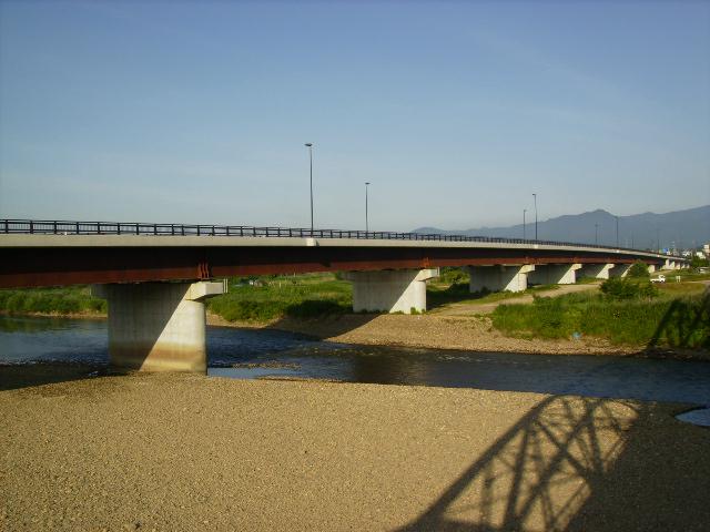 (写真は、トラス橋である長井大橋の影が映る、さくら大橋を右岸側から撮影)