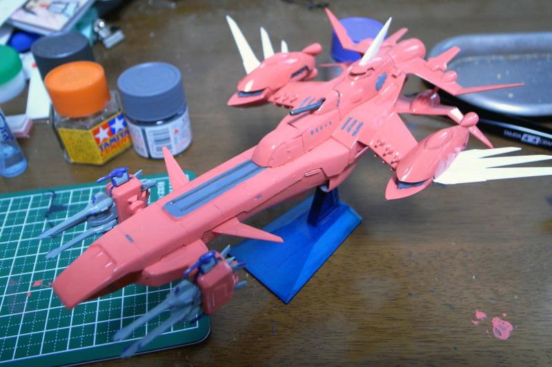 1/1700エターナルです。機動戦士ガンダムSEEDというテレビアニメに登場する宇宙戦艦で、ヒロインのラクス・クラインが乗っています。女の子の船なのでピンク色なのかも。バンダイのガンプラの仲間なのだけれども、結構細かく、作りごたえがありました。