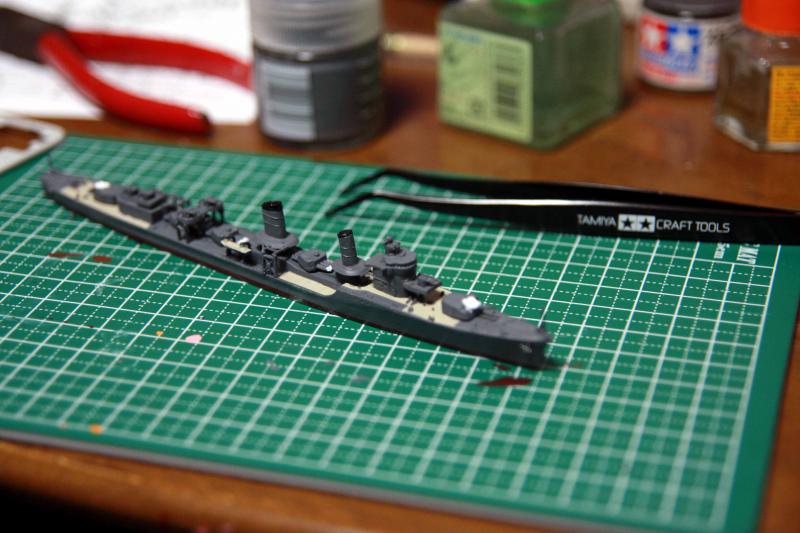 1/700の軍艦は「ウォーターライン」というシリーズで出ています。もっともこのキットは船自体がマイナーなせいか、シリーズに入っておらず、ピットロードというメーカーのものです。インターネットで取り寄せました。「ウォーターラインシリーズ」に一番はまったのは中学2年生の頃です。当時は米沢はずっと田舎で、模型雑誌の作例に出てくるような工具が手に入らず、道具にあこがれて過ごしました。今は便利な世の中になり、欲しくて手に入らなかった道具が簡単に手に入ります。ところが実際には道具はあっても目が見えず、手は震え、「今が中学2年生なら」と思いながら作っています。1/700の駆逐艦はとても小さいのです。