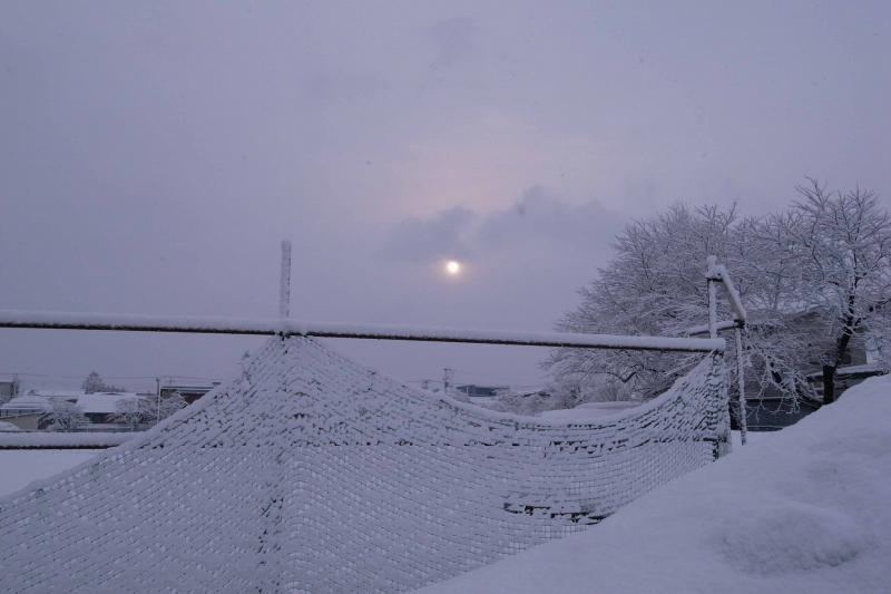 雲の中から太陽がちょっとだけでました。朝のグランドです。