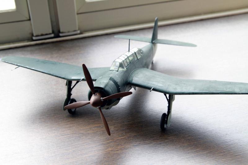 大体組み上げて、あとは細部とデカールを貼るところです。なかなかスマートで流麗な格好のいい機体です。ここから見ると逆ガル式の形状がよくわかります。飛行機がなぜ飛ぶかはまだわからないところがあるそうですが、飛ぶんだからいいよね、といったいい加減さが結構好きです。