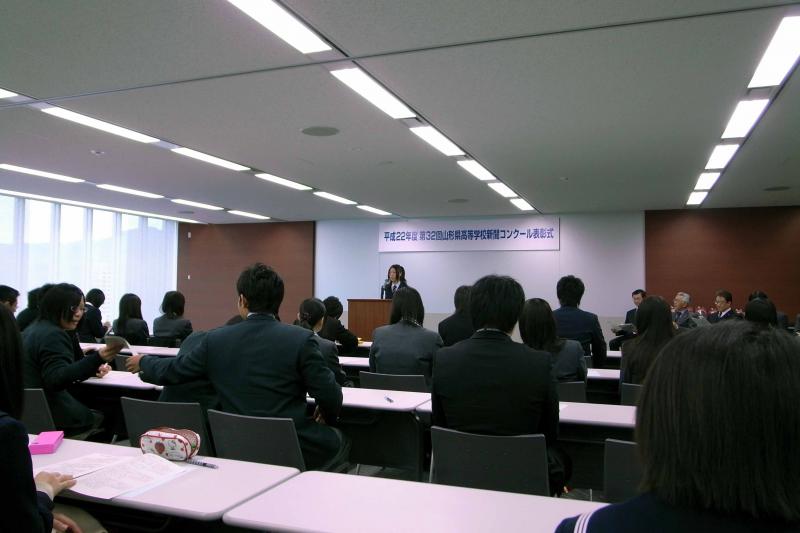 山形新聞本社で、山形南高の校長先生(専門部部長)や、山形東高の校長先生(新聞コンクール審査委員長)、山形新聞社の社長や編集部のみなさんが列席する中、部長の渡部愛さんは全県の加盟校の新聞部員の前で堂々の自校紹介。(当初のプログラムにはない、突然の指名だったためかなり緊張)山形県でもっとも古い伝統を持つ私立学校であることを紹介しました。