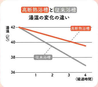 高断熱浴槽なら、4時間たっても湯温の低下は2.5度以内。40度前後の
