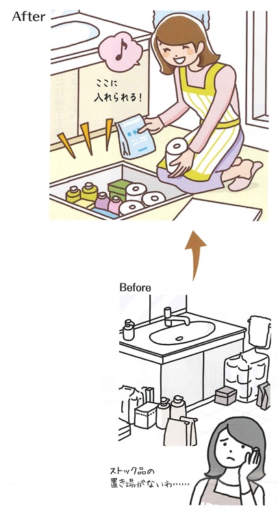 たとえば、狭いのにものが多い洗面所。床下収納があると、シャンプーや