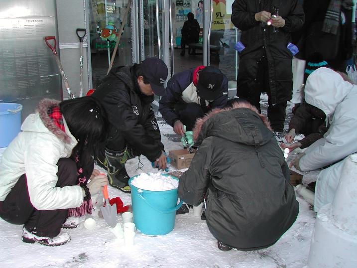 バケツで作った”かまくら”にろうそくを灯す準備です。たくさんあるので大変です!