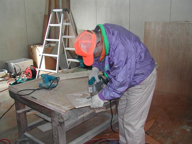 日程がかみ合わずに延び延びになっていた、双松バラ園の看板作りにようやく取り掛かりました。いつもお世話になっている強力な助っ人『美しいやまがた森林活動支援センター』さんの本拠地”旧宮内吉野分校”の作業場で、伊藤棟梁の指揮の下皆さんに手を貸して頂きながら作業が進められました。