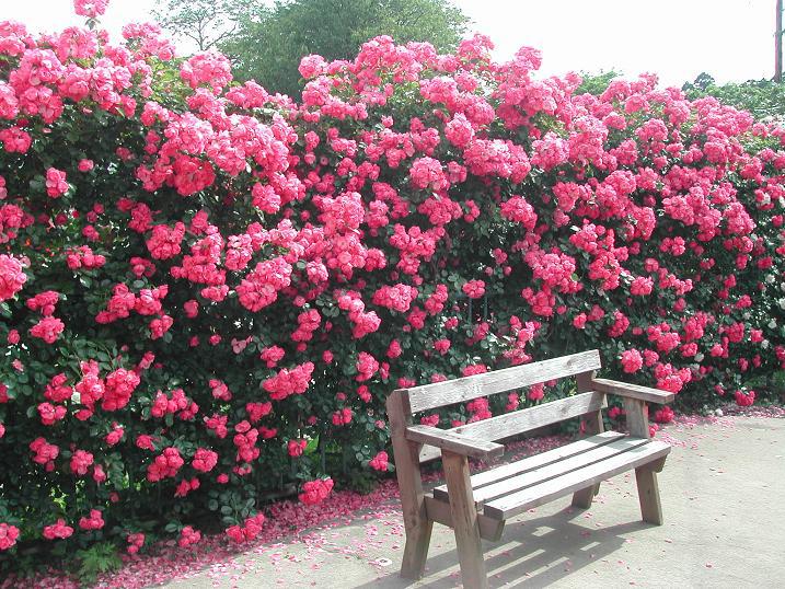 バラ園北入口の第6花壇区にある”ブルボンクイーン”が今年も綺麗な花を咲かせています。ちょうど前にベンチが置いてありますので、一面の花をバックにお写真を1枚いかがですが?