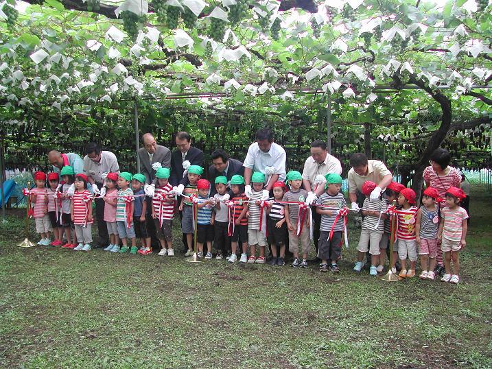 7月31日に『紫金園』さんで観光ぶどう園の開園式が行われました。ぶどうの開園式と言えば「暑い!」というイメージですが、当日は雨は降らなかったものの今までになく涼しいお天気でした。