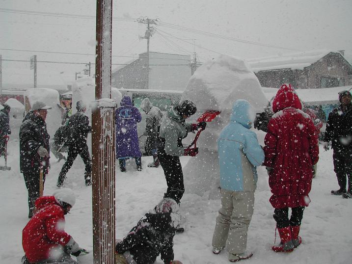 も同時開催されました。”雪像コンテスト”に向けて吹雪のなか頑張っています!