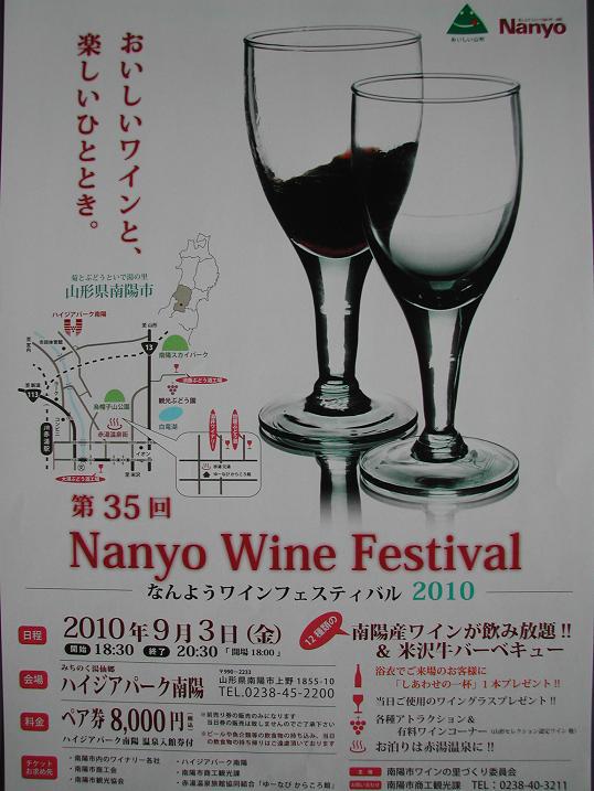 県内有数のワインの産地ならではのイベント、「第35回ワインフェスティバル」が行われます。南陽産ワインが飲み放題!、さらに米沢牛のバーべキュー付きです!(^^)