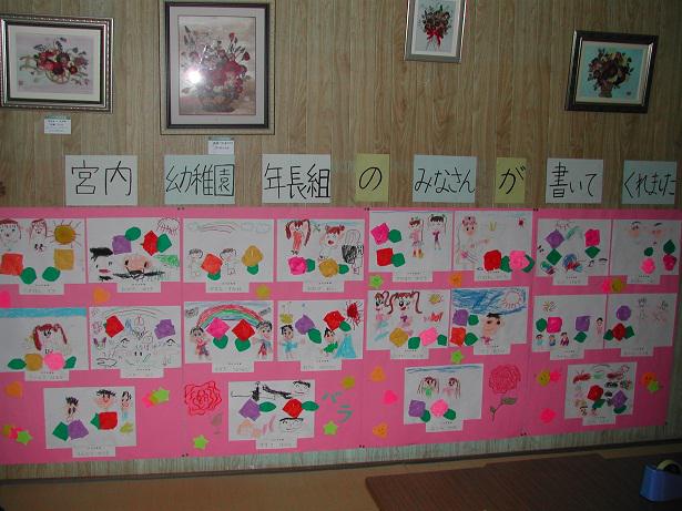 ただ今、双松コミュニティーセンター1階に、宮内幼稚園の年長さんが描いてくれた”双松バラ園”の作品を展示しています。