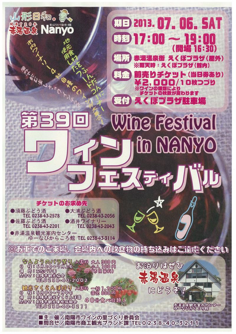 7月6日(土)午後5時から「第39回ワインフェスティバル」が行われます。市内ワイナリー4社自慢のワインが楽しめ、地元の食材を使用したフードコーナーもございます。ワイン好きの方、ぜひどうぞ♪(当日券もあります)