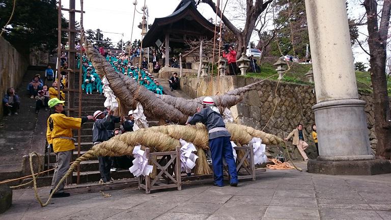 本日、年に一度の烏帽子山公園大鳥居の注連縄掛け替えが行われました。近くで見るととても大きく感じます。桜の開花状況は二分咲きくらいです。
