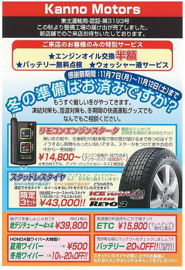11月7日(月)より11月12日(土)までの一週間です。ご来店の方にエンジンオイル交換半額 ウオッシャー液満タンサービス スタットレスタイヤやバッテリもお買い得です。是非ご来店ください。