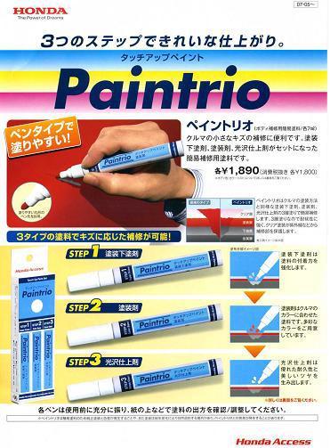 今までのタッチアップペイントは、先端が“はけ”だったため線傷などは塗りにくかったですよね。これはマジックのペン先のようになっているためとても塗りやすいようです。また下地、塗料剤、光沢仕上げと3つがセットになっていてよさそうですね。