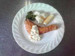 メニューは「鮭のフライ」と「ベーコンとキャベツのスープ」です。