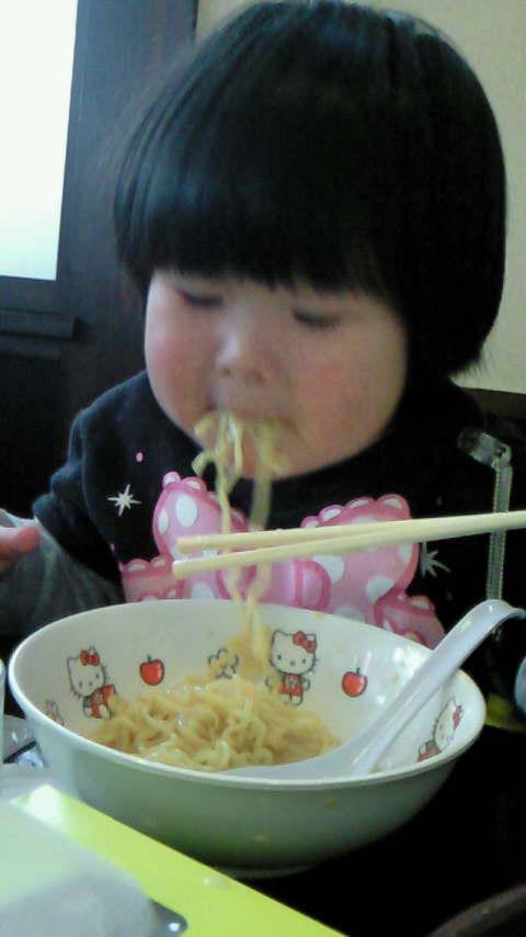 ラーメン大好きな子供たち、お兄さんは、おいしーぃと ズルズルたべてます。妹は、おいちーと 食べました。