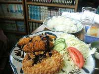 ウェイスタッフayayaちゃんとホッシィは、二人揃って本日の日替わりを注文。メンチカツとコロッケと魚のフライ、ボリューム圧巻の3本立てです。うう、若いってスバラシイーと思いましたが、風邪気味で昨日まで3食お粥だったというホッシィはいずれも1/2個ずつ食べてギブ。(昨日までセミ流動食で、いきなりミックスフライは無謀でしょー。それもやはり若さなのかしらー。)と心の中でつぶやきつつ、手作りのコロッケの味にカンゲキし、結局ホッシィの食べ残しをちょっとずつつついた私が一番お腹いっぱいになったのでした。