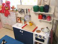 なんと真紀さん手作りのキッチンセット(すごーい)。布だけでなく、お部屋のあちこちに真紀さんの才能とセンスが発揮されたコーナーがあります。お子さんたちは男の子なので、ボーイズなおもちゃもあるんだけど、これも一つの食育だなーって思います。