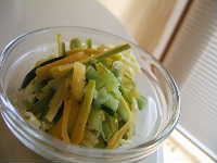 直売所のJA南館店で買ったキュウリと、葉っぱ付きの黄色いニンジン、キャベツのコールスロー。調味料は、岩塩+生協で買った素製糖+あぢやま醤油の米酢+イタリアのお土産にいただいたバジル入りのCONDIのオリーブオイル。「料理とは、調味料を多少いいものにしておくと、腕がなくてもおいしくなる」を実感した一品でした。