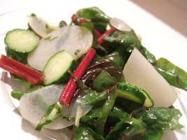 一緒に届いたのが掘りたてのジャガイモ。「いまの時期はやわらかいから、さっと茹でるだけでいいですよ」と、栽培している伊藤さんに教えてもらったのがこのサラダ。薄くスライスしたジャガイモを熱湯でささぁっとしゃぶしゃぶにして、ちぎったスイスチャード、キュウリと一緒にドレッシングであえました。