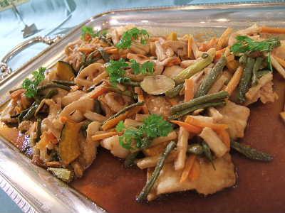 料理はバイキング形式で、めずらしい料理もだされます。写真はなまずと夏野菜のフライ。なまずは淡泊な白身で食べやすく、いろんな料理に使えそうな感じでした。