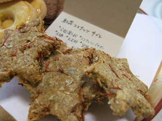 こちらは紅花入りのココナッツサブレです。甘さは米糠と甜菜糖、全粒薄力粉で、ひまわりの種や豆乳などが原材料。