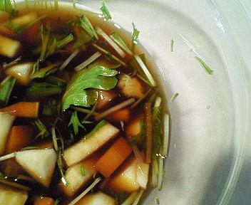 甘酢の漬けたれは2回使っています。2回目は野菜から出る水分で、しょっぱさや酸味がまろやかに。