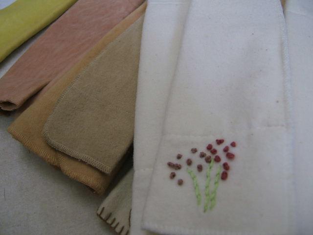 写真は刺繍入りと、びわやタマネギの草木染めした布ナプたち。