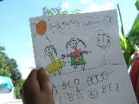 取材中、愛娘ちゃん(4歳)が「はい、あげる。これはワタシとアナタ!」とくれた絵。さすが、彫刻と絵を手掛ける作家夫婦の子ども。将来がたのしみです。