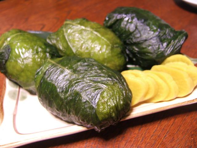 おにぎりを漬物の青菜で包んだもの。