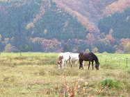 最上町の前森高原内にある冒険学校の取材に行ってきました。向かいの乗馬体験の馬舎では、お馬さんが散歩&食事中でした。
