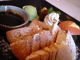 ホットケーキフェア中だったので、ランチ代わりに食べた和風のホットケーキ。黒蜜&抹茶のアイスクリーム、あずきが添えられていました。