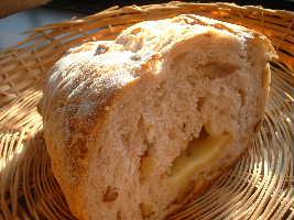 このパンのすごいところは、チーズの芳香力を体感できるところ。生地の中央に「1切れ」ほどのチーズが入っているのだけど、トースターで温めると生地全体に濃厚な風味が「じわじわじわ〜」っと染みわたっていく感じで、そこにクルミのコクやらじゃがいものモッチリ感が加わって、厚さ1.5cmほどのスライス1枚でも十分な満足感。