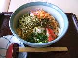 讃岐うどんのお店で食べた「杉奈ぶっかけ」。さっぱりしたつゆで、天花、きゅうり、カニかま、半熟卵などがのっています。