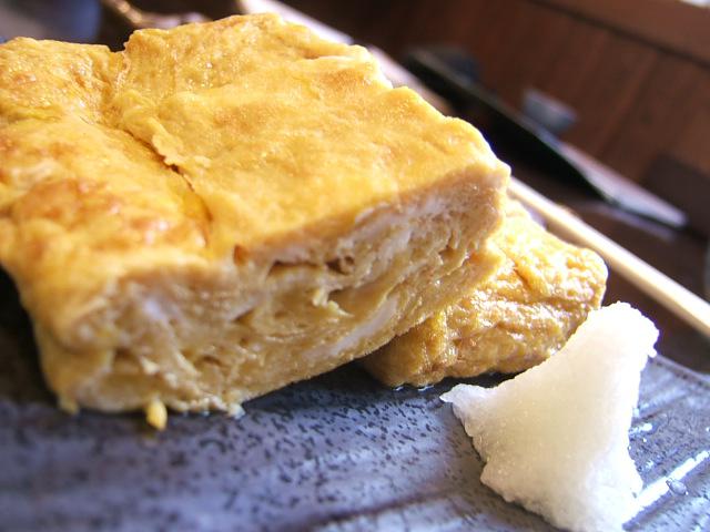 山形市城南町2にあるお蕎麦屋さんの「出し巻き卵」。甘さは控えめ、だしの味をたっぷり含ませ、日本酒にも合う味付けでした。