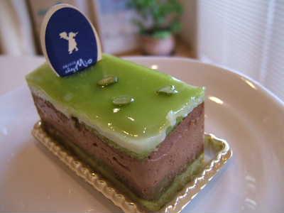 お友達のおみやげにいただいた『シェ・ミオ』さんのケーキ。ピスタチオの香ばしさが感じられ、ホワイトチョコとチョコレートが層になっています。