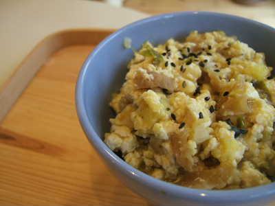 冷蔵庫内の半端ものでつくった思いつきの丼メニュー。伊藤んさんちの無農薬野菜で作ったポテトサラダ(ノンマヨネーズ)と豆腐半丁、福神漬をフライパンでちゃちゃと炒めて、ご飯にのせました。小ネギがあればなお色どりもよかったのですが、間に合わせで胡麻をふりました。食べてわかったのは、福神漬が入っていることがポイントです。じゃがいもと豆腐だけでもふわふわでおいしいのですが、それだと離乳食か介護食っぽくなってしまって、ちょっともの足りないかも。(^^)。