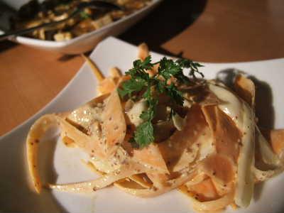 私が好きなニンジンのサラダが、こちらのお店にありました。ピーラーでひらひらに剥いたニンジンをマヨネーズドレッシングをからめます。うちでは細切りにしたニンジンも和えて2つの食感を楽しんでみたり。春巻きの皮を使ったピザもパリパリしておいしかったです。