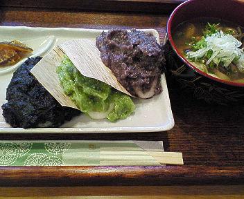 写真はお雑煮付きの三色餅のセット(お品書きにはミニ雑煮付きとありましたが・・・)。値段が500円とリーズナブルだったので、ちょっとしたおやつのイメージで注文したところ、お餅もお雑煮もしっかりしたボリューム。これならお昼としても十分なくらい。あー、まんぷくです。
