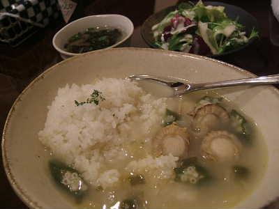 写真はあっさりしたスープかけご飯「ホタテのガンボ」。卵サンドやスイーツメニューもあるので、お茶タイムも利用できます。