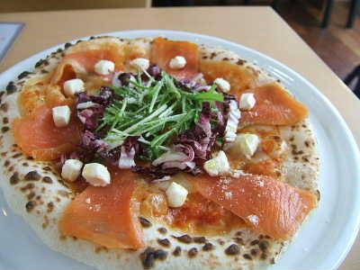 写真は天然酵母を使った自家製生地のピッツァ。もっちりと弾力があって、香ばしいー。アイスクリームを添えたフレンチトーストなど、デザートだけのカフェ利用もOKです