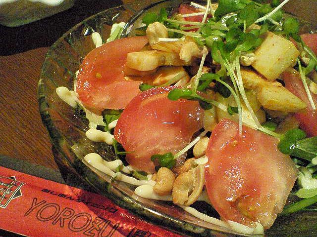 中華ベースの居酒屋メニューのほかラーメン、焼きそば、ご飯ものなどもあり、カウンター付きなのでお1人様OKのお店です。この日は板張りの座卓でおまかせコースを食べました。写真は豚肉とカシューナッツのサラダ。エビチリはふんわり焼いた卵の上にあんかけのようにかけてあり、まろやかな辛さ。