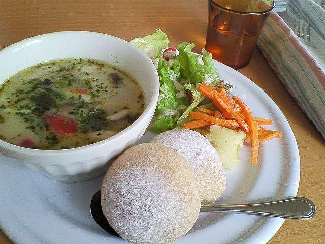 今日は久しぶりにランチたべました。写真はグリーンカレー&黒糖パン(ごはんにチェンジ可)のセット(900円)。カレーはさらさらのスープタイプで、きのこがたっぷり。スパイシーな味と黒糖の甘さがとても合っていました。