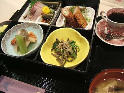 写真は遊膳ランチ(1200円)で、お造り、煮物など季節の小鉢に、ご飯と汁物、コーヒー付きです。