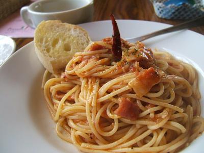 1階はカフェ風、2階はウッディな喫茶店で夜はバーになるとか。フードは本日のおすすめメニューなどもあり、ランチのパスタはサラダ、スープ、バケット、ドリンクで付きで840円。写真はトマトソースのパスタです。