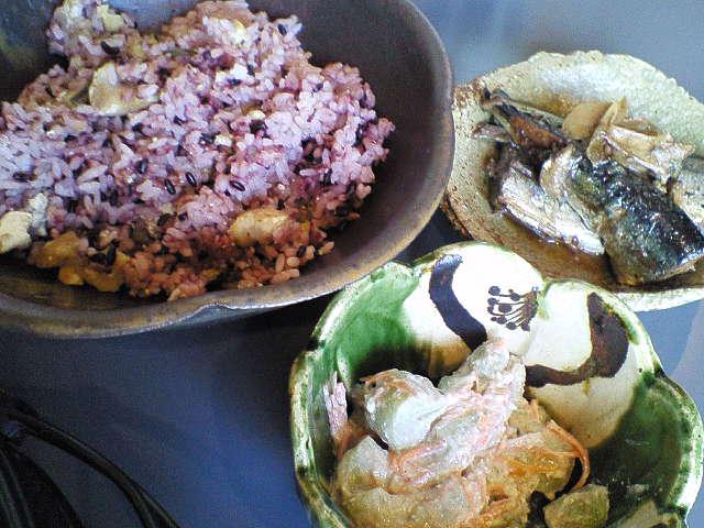 古代米を使った栗ごはんと、ずいきの白和え、秋刀魚の生姜煮。