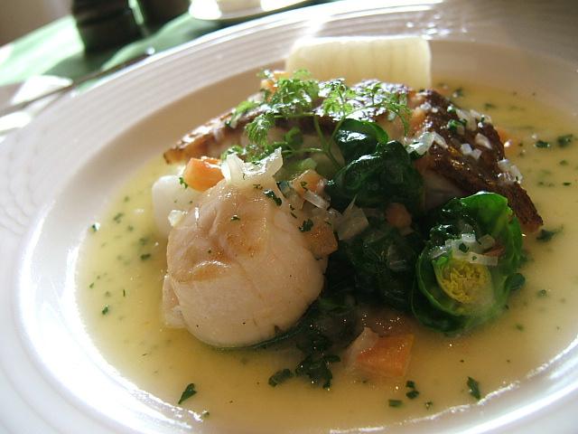 写真はお魚のランチでホタテと白身魚のソテー。