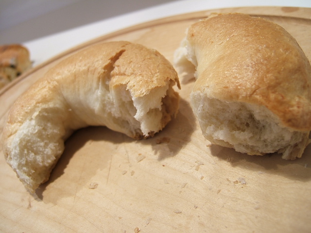 生のままだと皮の引きは強かったですが、なかはわりあいにソフト。焼いたらイギリス食パンをトーストした時のようなパリっと感がでて、中味は弾力のあるふんわり感。 スーパーハード系が好きな私としてはややもの足りないですが、山形におけるベーグルにこのタイプが多いのは、食べる側の嗜好がそうだからなのかもしれませんねー。