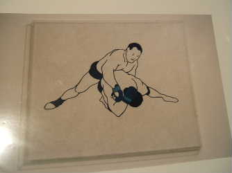 交流会に参加された方の中に、格闘家ばかりを描いているという方がいました。『アクティブアーツ』というピエゾグラフの会社を経営しているそうで、このイベントのためにわざわざ来られたとか。まだ20代(たぶん)なのに、名刺をみたらなんと銀座にオフィスが。「ぎ、銀座なんてすっごいね」と言ったら、「いや狭いところですから〜」と彼。「それにしたって〜」などと話しつつ、これまで描いてきた作品を見せていただきました。 芸工大の日本画コース出身だそうで、日本画の絵の具を使って描いたおすもうさんや行司の方などが多かったのですが、写真のような作品も。なんだかかわいいー。激しく闘っているはずなのに、2人ともワザをわすれちゃったかのような間があって、くすっ・・・としたおかしみを生みだしている感じです。